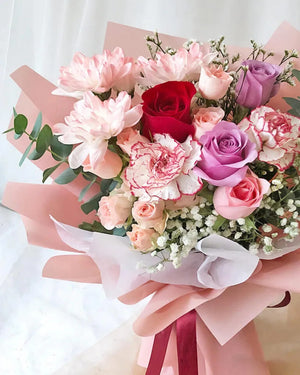 A stunning blend of lite pink spray roses, double-color carnations, purple roses, and a single red rose, creating a rich and vibrant floral arrangement. -