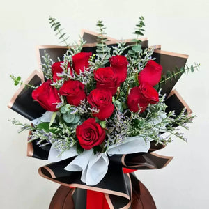 - Elegant & Contemporary: A modern bouquet featuring premium 10 red roses, complemented by delicate caspia and eucalyptus.
